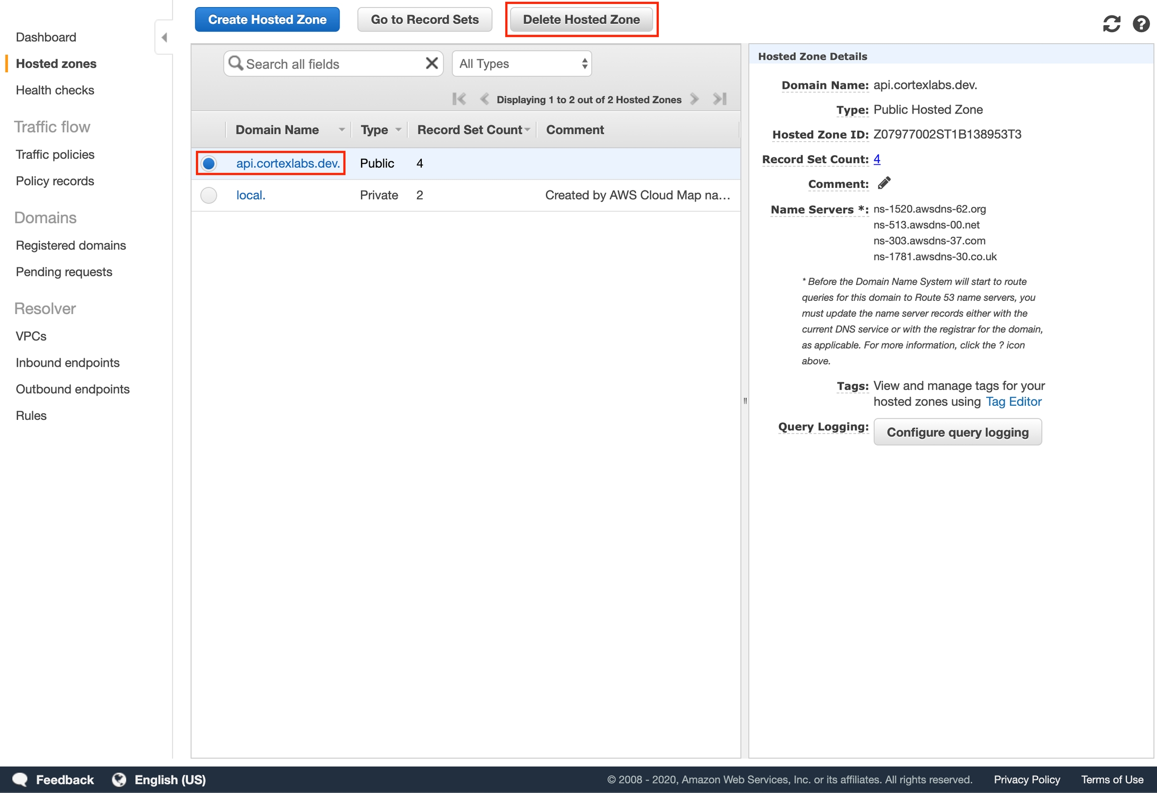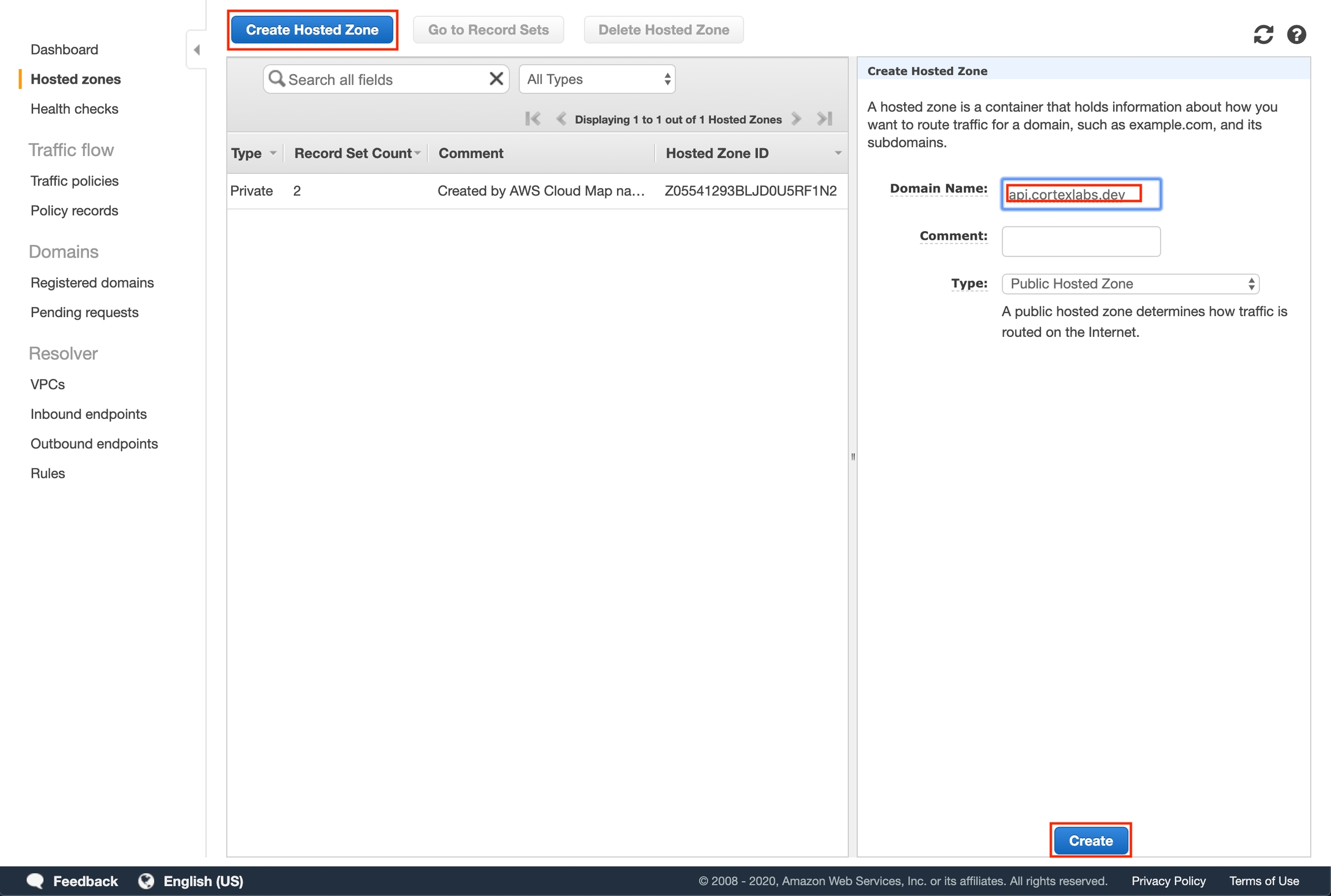 Go back to the Route 53 console and select the hosted zone you created earlier. Click "Create Record Set", and add an Alias record that routes traffic to your Cortex cluster's API load balancer (leave "Name" blank).