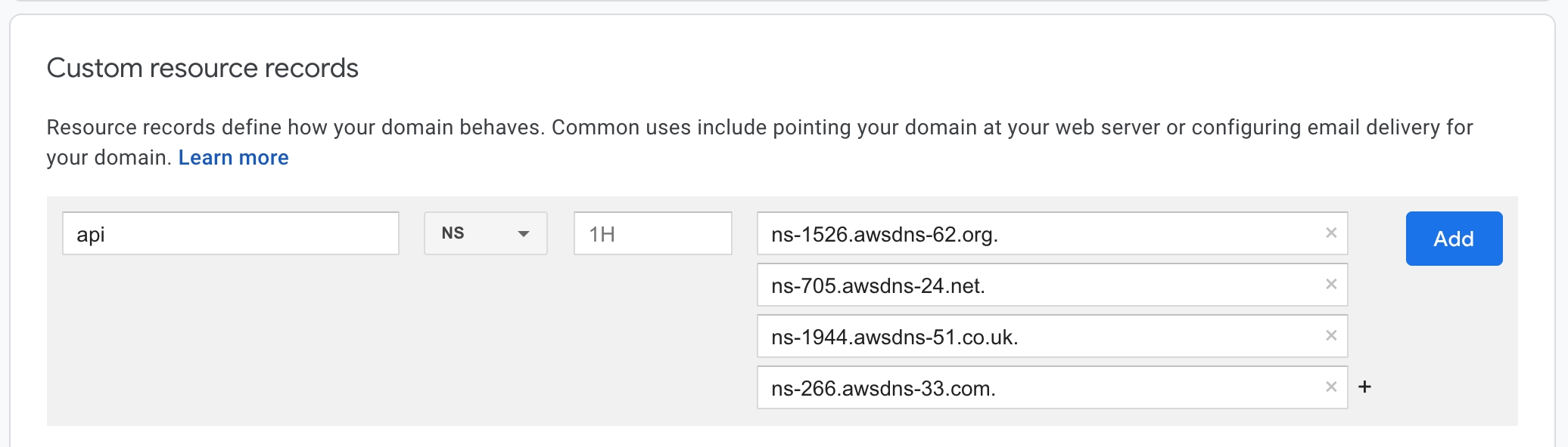 We are going to add an NS (name server) record that specifies that any traffic to your subdomain should use the name servers of your hosted zone in Route 53 for DNS resolution.
