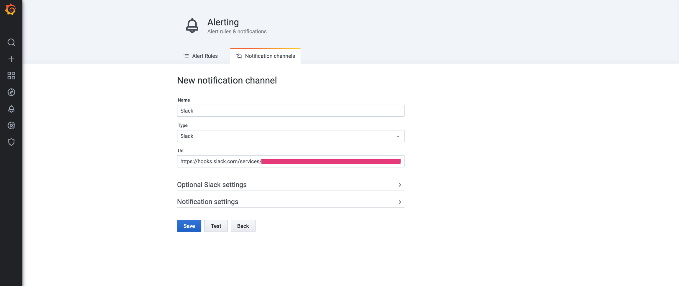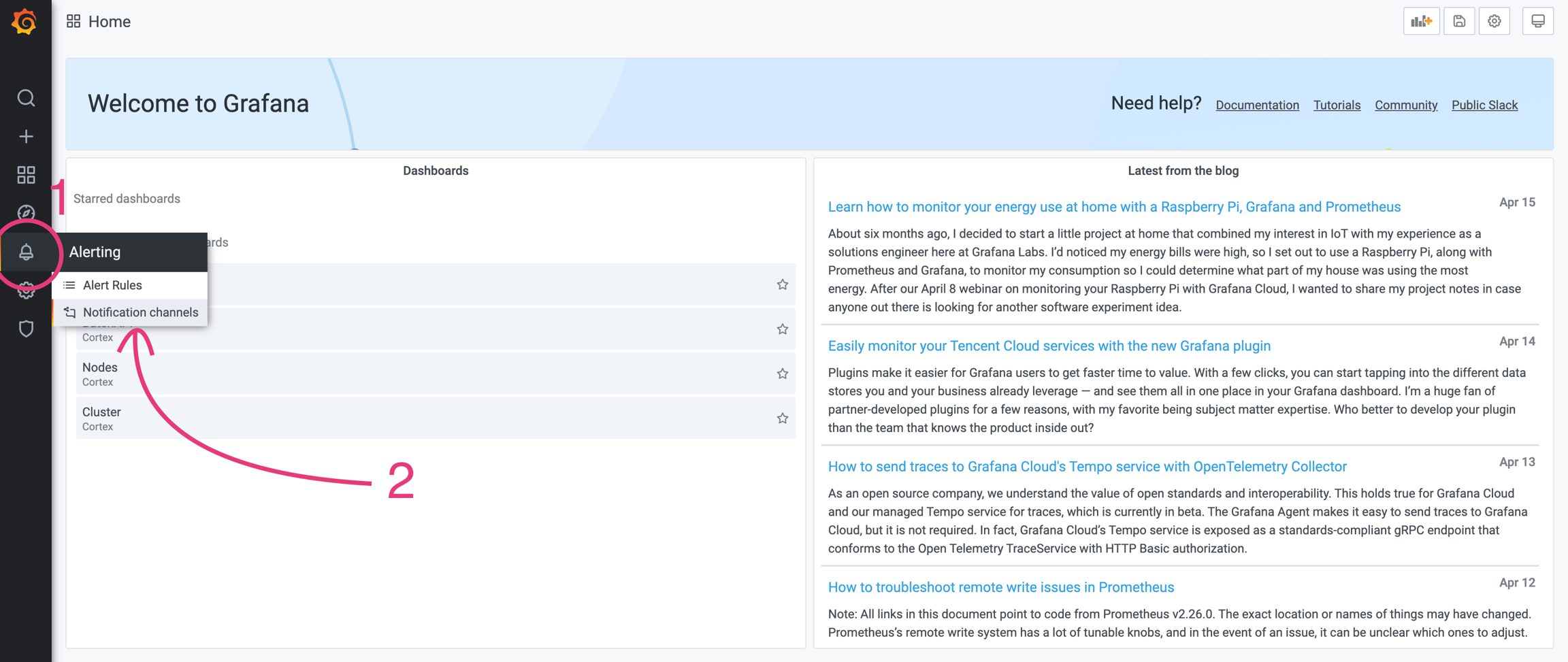 Go to Grafana and on the left-hand side panel, hover over the alerting bell and select "Notification channels".