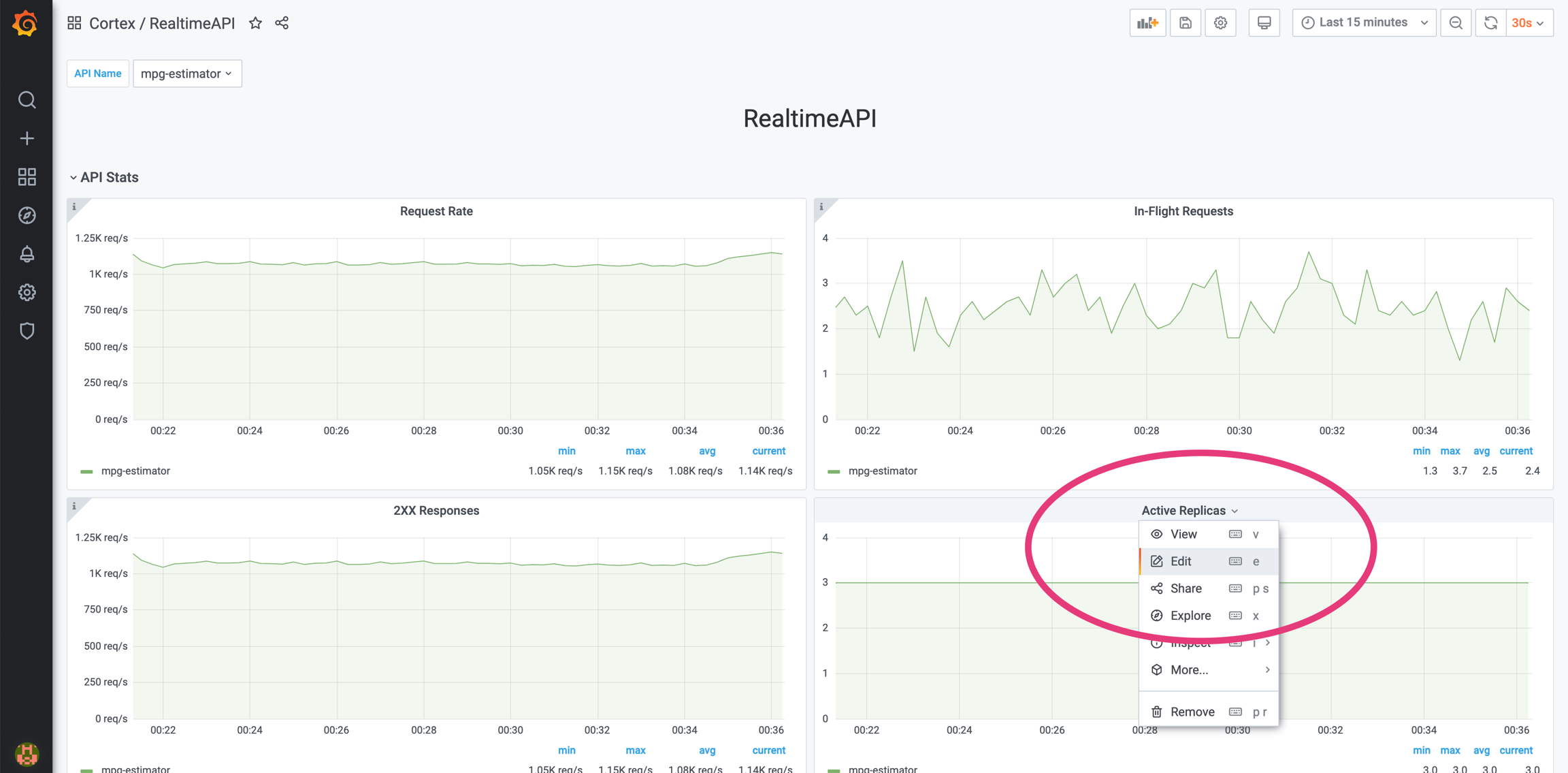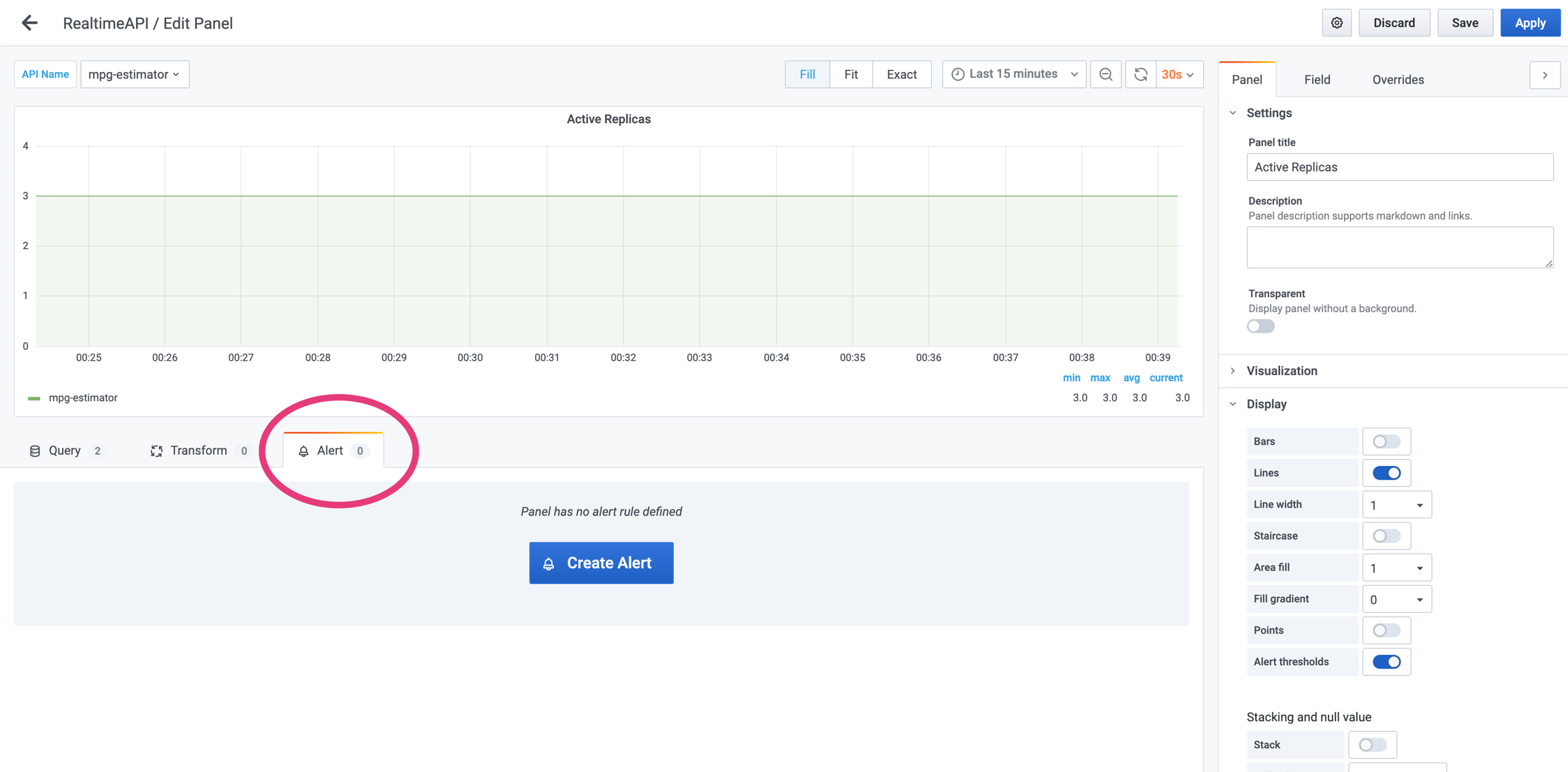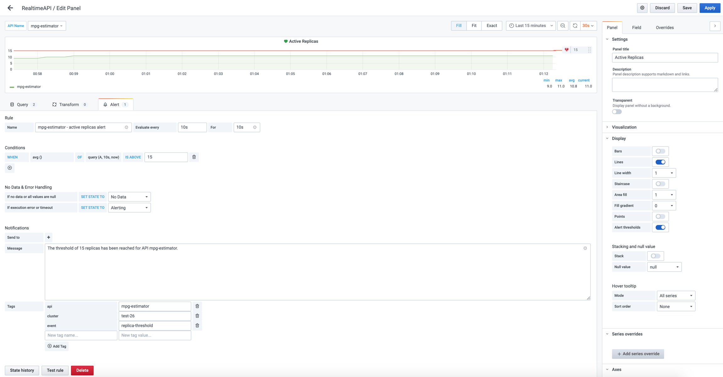 Let's create an alert for the "Active Replicas" panel. We want to send notifications every time the number of replicas for the given API exceeds a certain threshold.