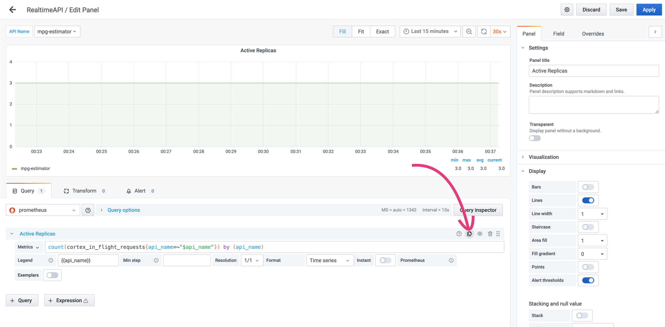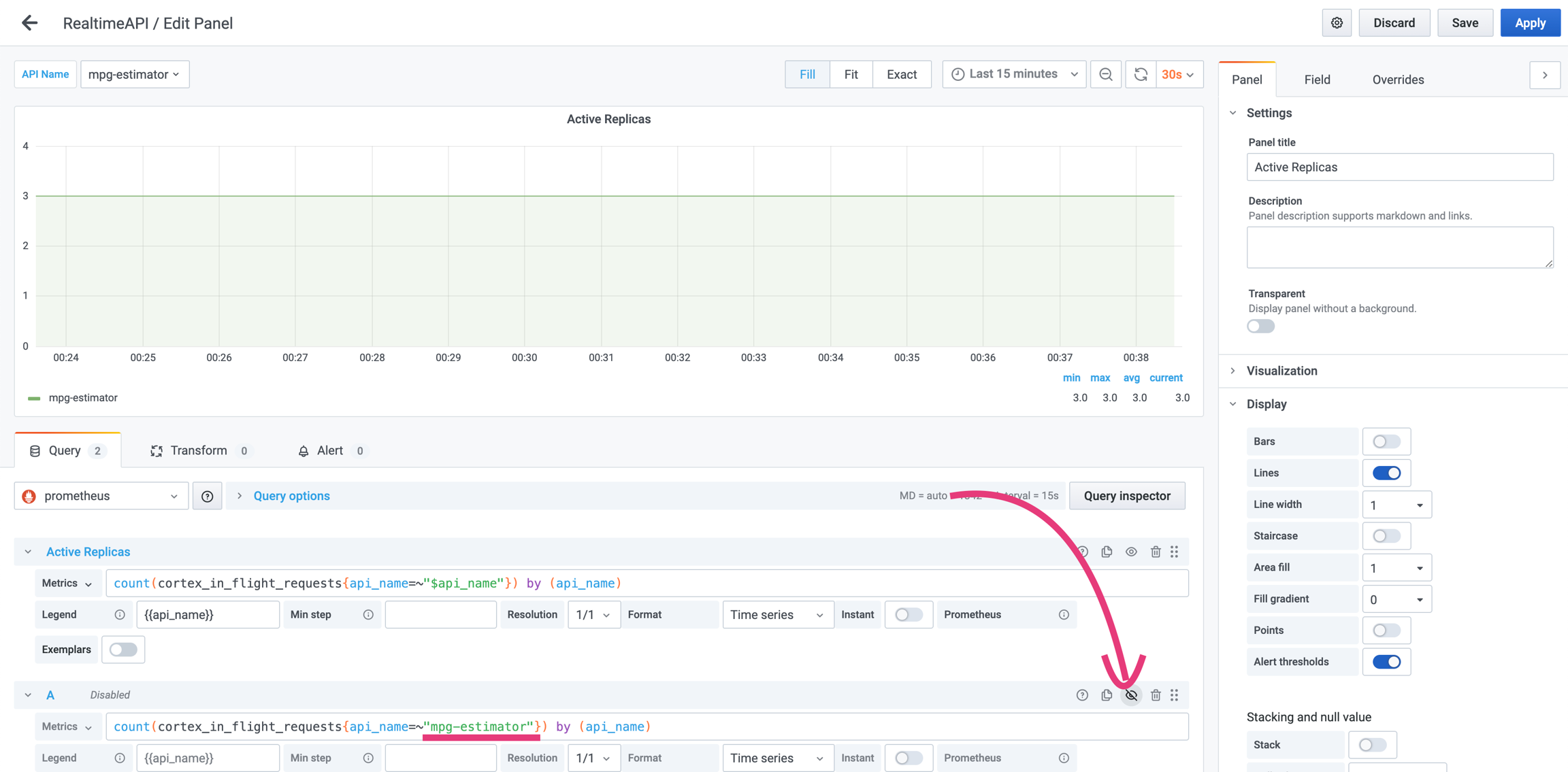 In the copied query, replace the $api_name variable with the name of the API you want to create the alert for. In our case, it's mpg-estimator. Also, click on the eye icon to disable the query from being shown on the graph - otherwise, you'll see duplicates.
