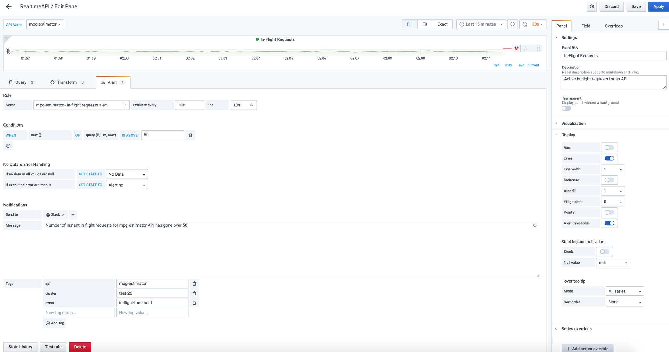 Let's add an alert on the "In-Flight Requests" panel. We want to send an alert if the metric exceeds 50 in-flight requests. For this, follow the same set of instructions as for the previous alert, but this time configure the alert to match the following screenshot: