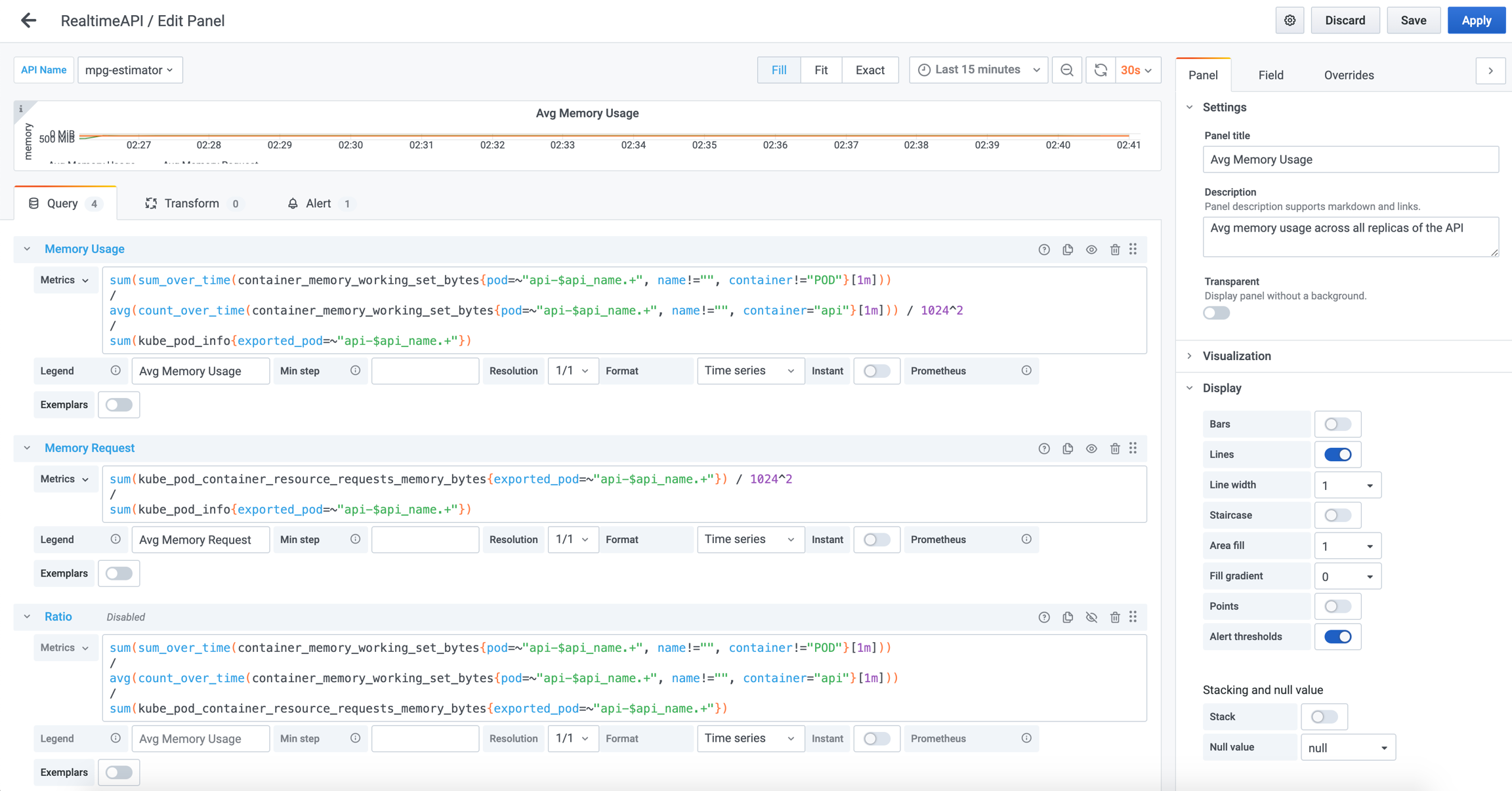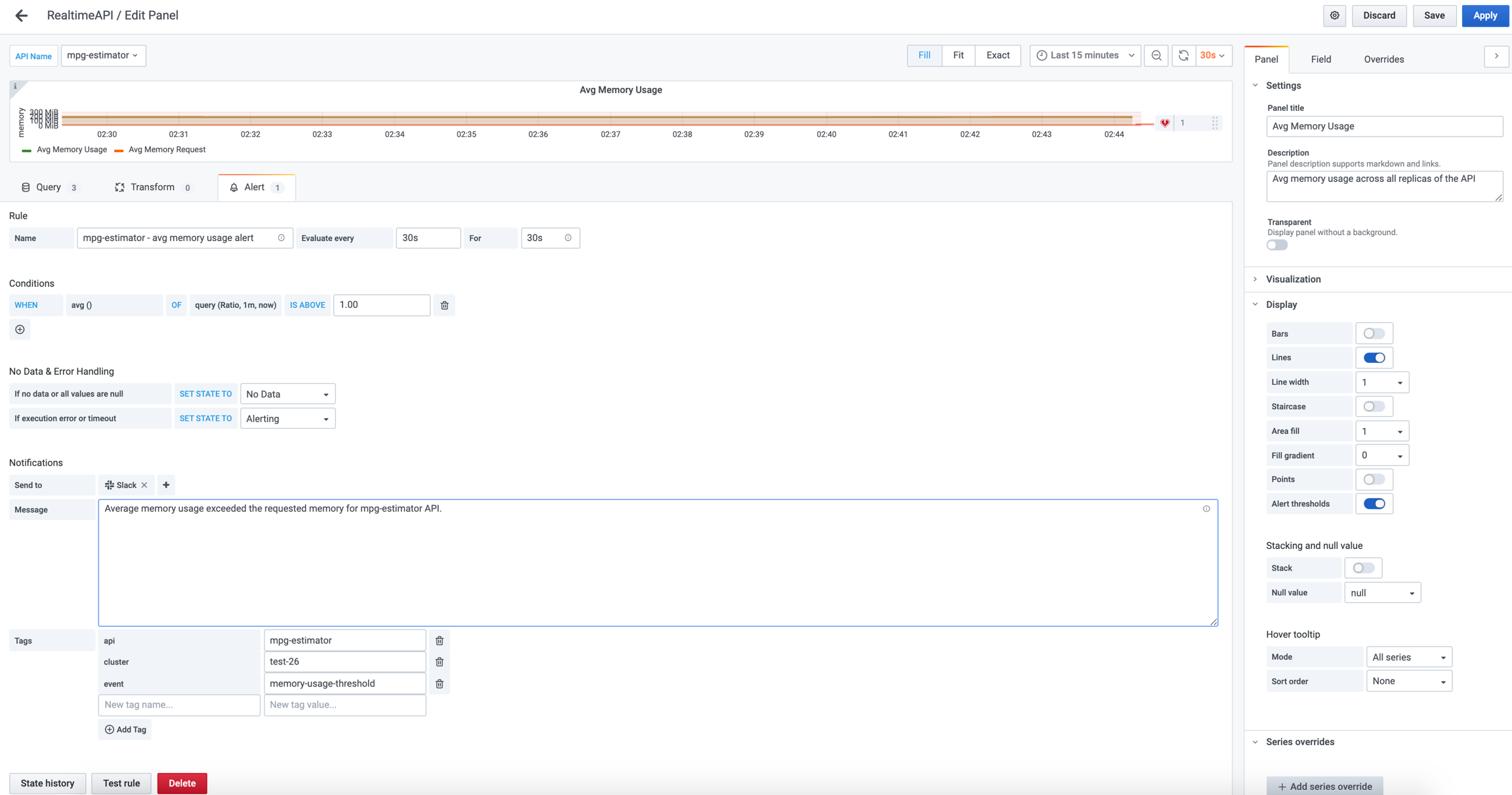 Let's add another alert, this time for the "Avg Memory Usage" panel. We want to send an alert if the average memory usage per API replica exceeds its memory request. For this, we need to follow the same set of instructions as for the first alert, but this time the hidden query needs to be expressed as the ratio between the memory usage and memory request: