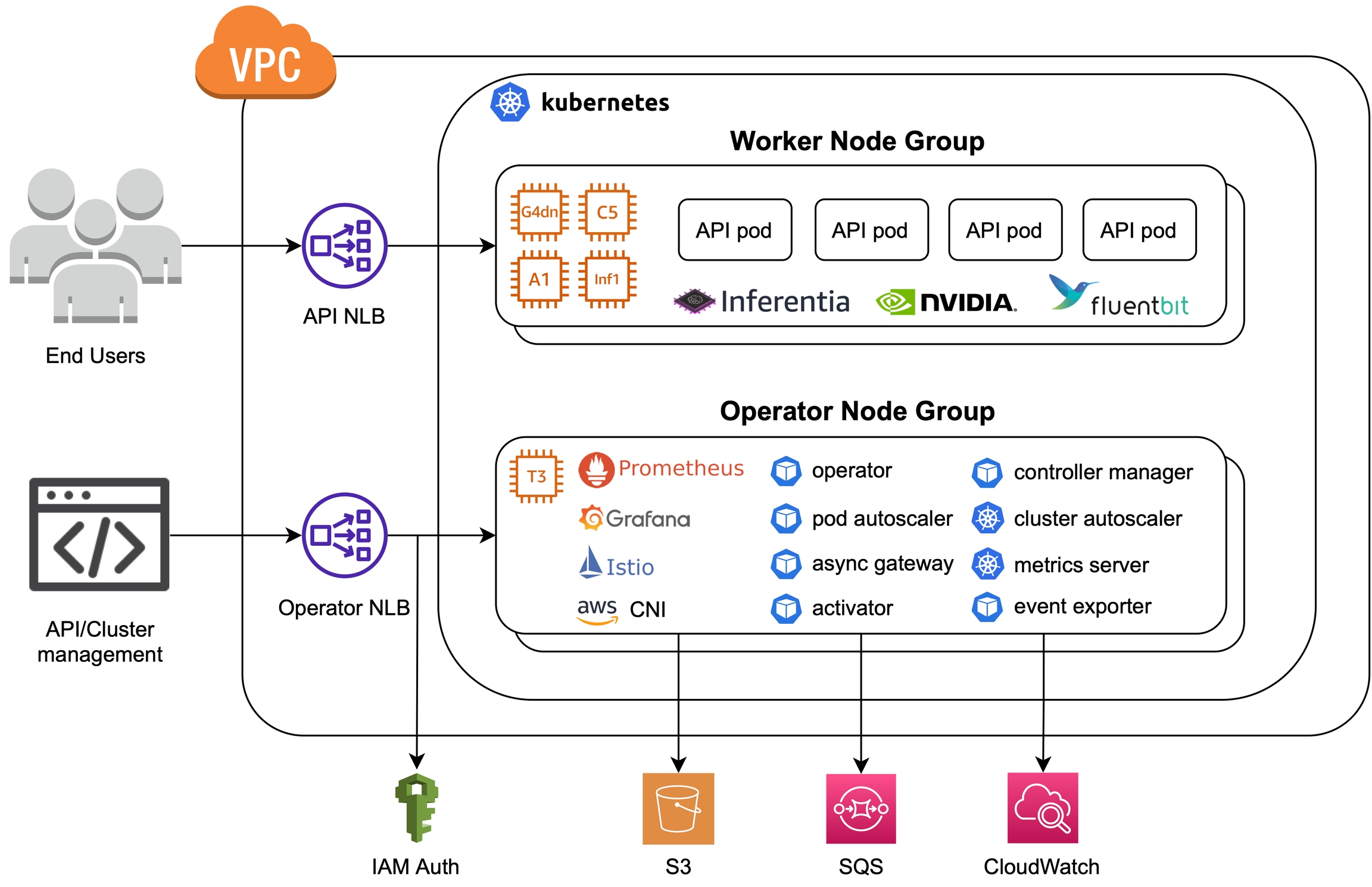 The Kubernetes cluster uses EC2 autoscaling groups for its worker node groups. Cortex supports most EC2 instance types, and the necessary device drivers are installed to expose GPU and Inferentia hardware to your workloads. Reserved and spot instances can be used to reduce costs.